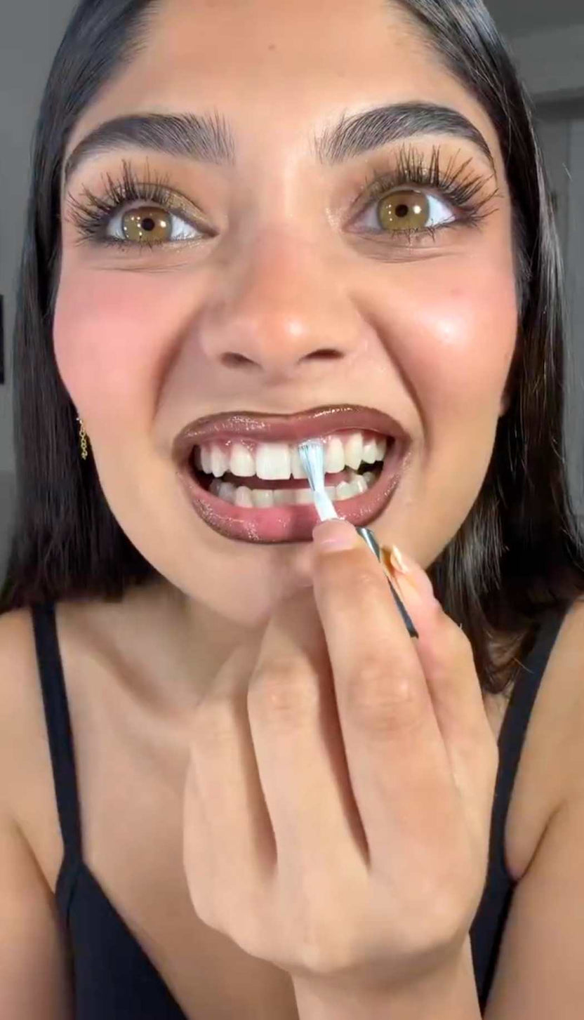 Sollten sich Lackreste zwischen den Zähnen befinden, entfernen Sie diese vorsichtig mit Zahnseide, um ein optimales Ergebnis zu erzielen.
